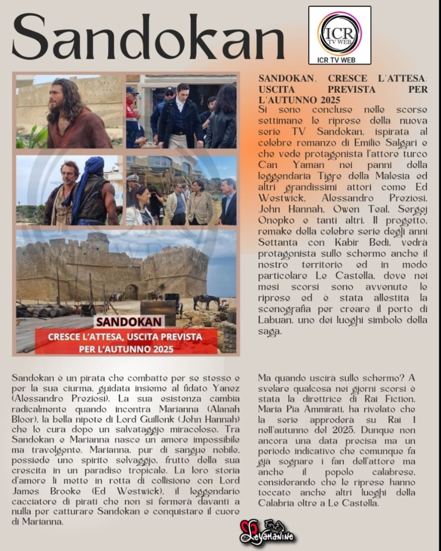 През последните седмици приключиха снимките на новия сериал “Сандокан” по известния роман на Емилио Салгари с турския актьор Джан Яман в ролята на легендарния Тигър от Малая и други прекрасни актьори като Ед Уестуик, Алесандро Прециози, Джон Хана , Оуен Тийл, Сергей Онопко и много други. Проектът, римейк на известната поредица от 70-те години на миналия век с участието на Кабир Беди, ще види и нашата територия на екрана и по-специално Le Castella като главен герой, където се проведоха снимките през последните месеци и където бяха създадени декорите за създаването на Пристанище Лабуан, едно от емблематичните места на сагата.