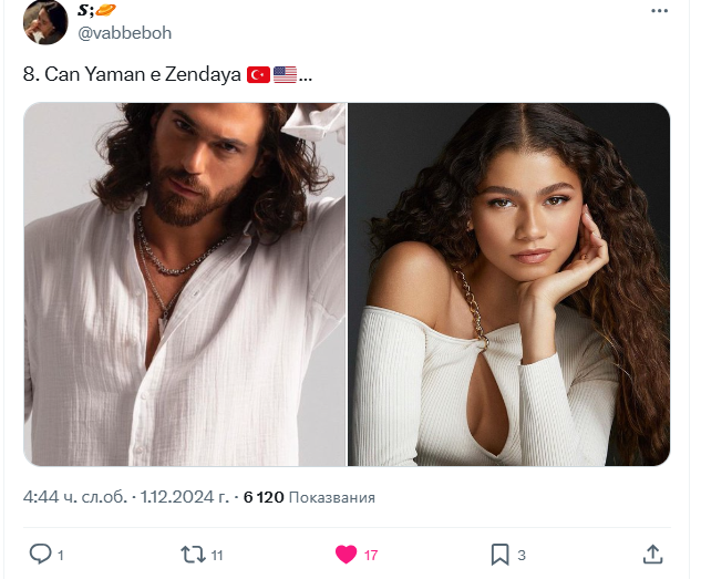 А баш, и аз сефте я чувам таз Zendaya Laughing Явно си играят и спрягат турски звезди с некви световни, ама AI ДГД Imp Laughing Хич ми не е подходяща, ама хич (нали казват, че за твойто си никоя снаха или зет не са достатъчно добри, та и аз така Smiley )