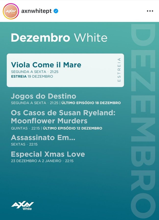 „Viola Like the Sea“ по AXN White Portugal от 19 декември, от понеделник до петък в 21:25 местно време....