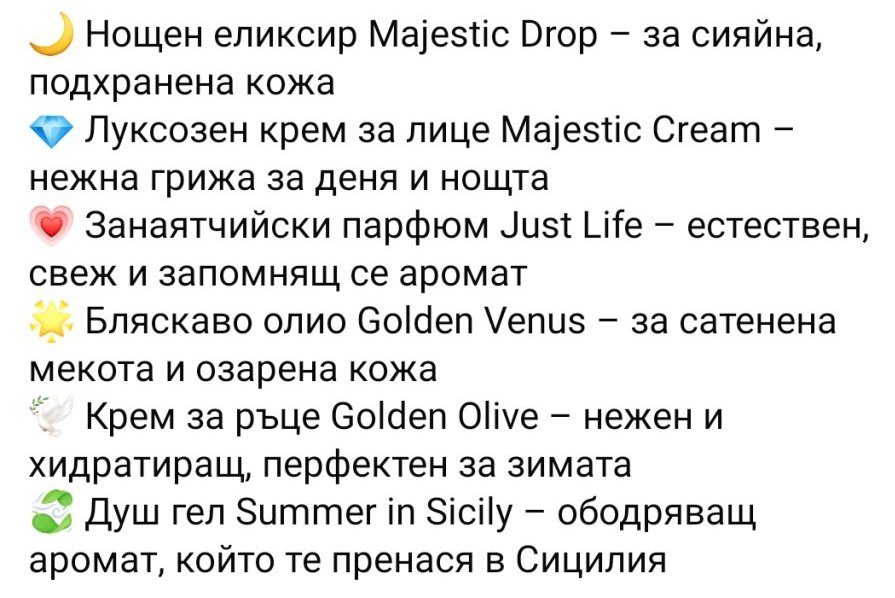Другия месец казаха , че ще имат доста намаления и изненади, понеже правят 10 години.  Иначе аз си поръчах кутията основно за парфюма. Серума е хубав, не е мазен. Крема не съм ползвала. Крема за ръце винаги е нужен. Душгела е малък и е добре и за пътуване. Олиото с брокат няма да използвам, но ще му намеря място някъде.
