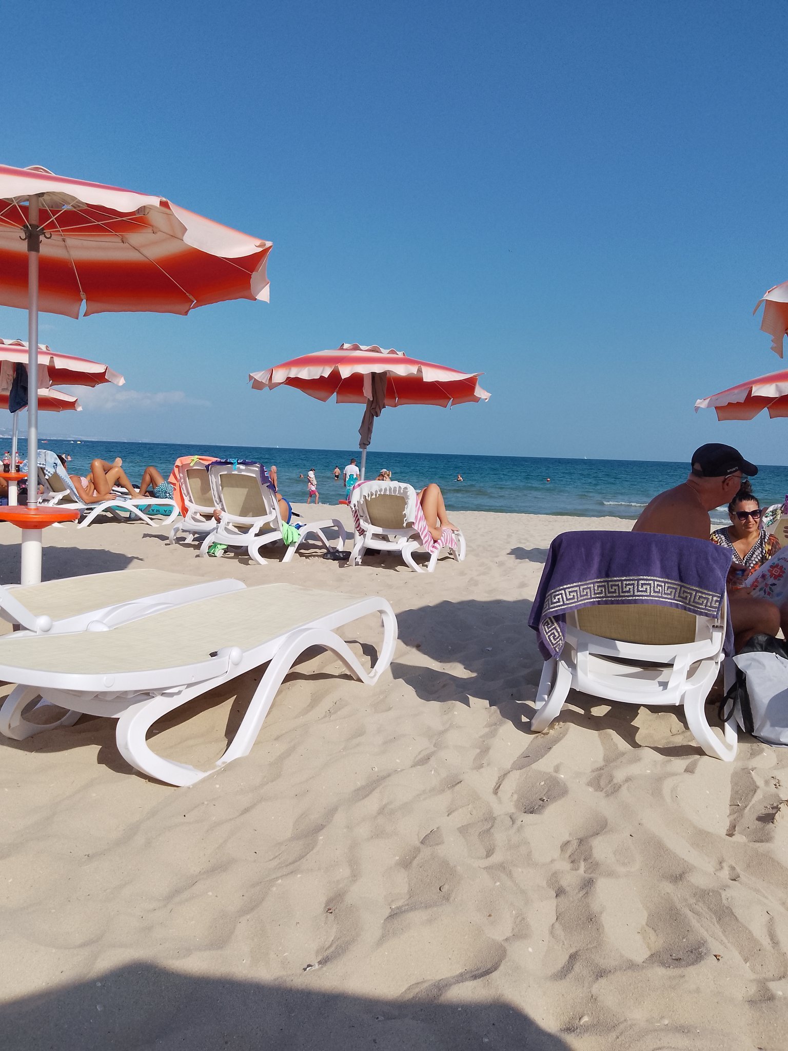 И в морето се окъпахме, дори жена ми и детето още са на плажа. На третия ред - няма никаква разлика с първите два реда. С меки шезлонги, каквито за пръв път през живота си ползвам