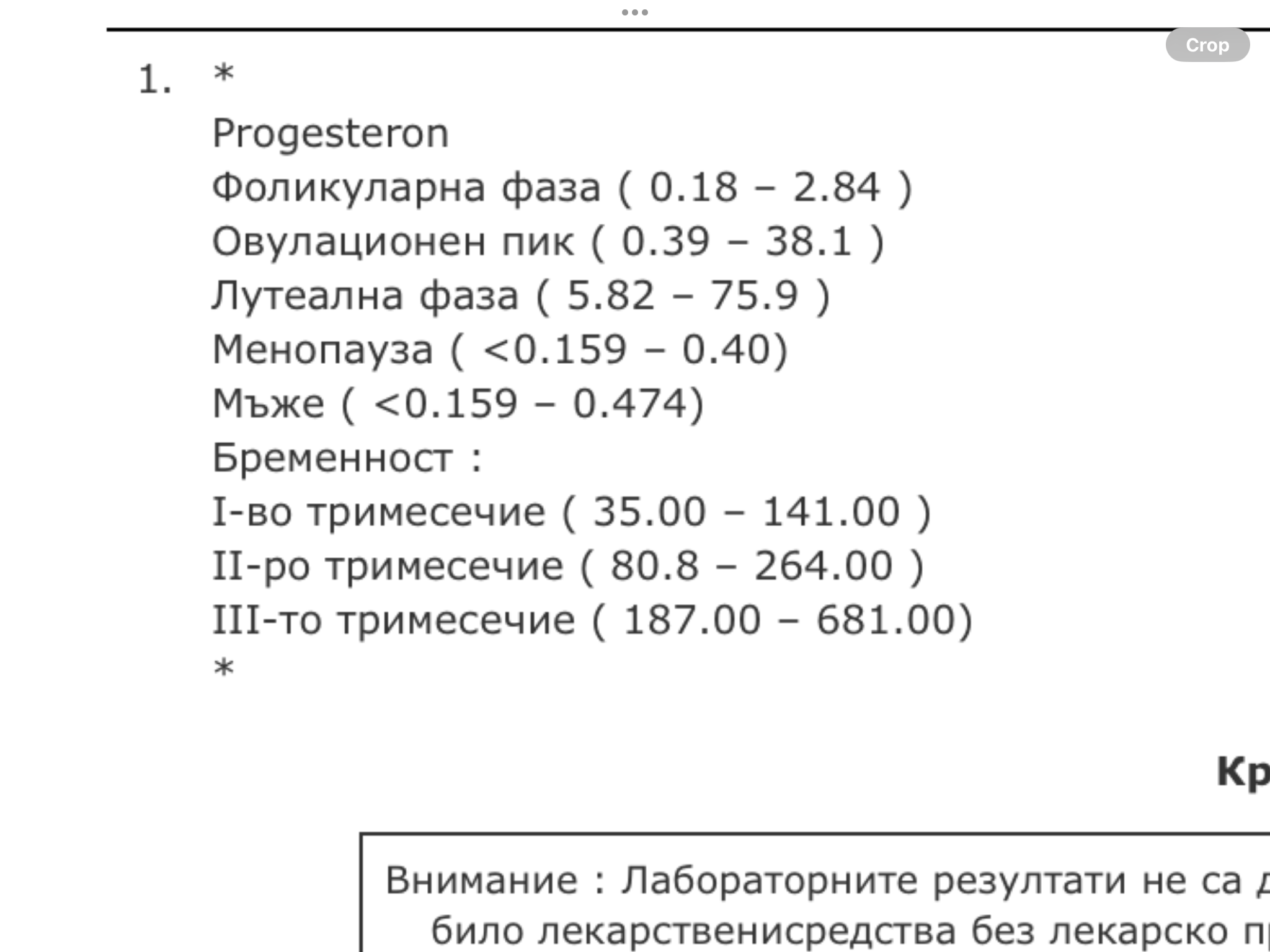 Здравейте, дами. Днес (на 4ти ден след доказана овулация с лентички) изследвах прогестерона. Причината беше, че овулацията се оказа на 21-вия ден от по принцип 28-дневен цикъл, защото четох, че е възможно при къса лутеална фаза (каквато може би е моята) причината да е в нисък прогестерон. За пръв път следя овулацията си и не знам дали просто мц ще се удължи или ще се окаже къса ЛФ. Все пак теших да отида на изследване. Ще повторя на седмия ден.