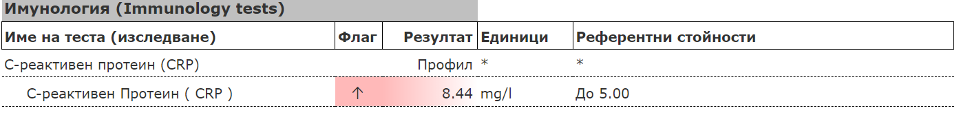 CRP бях пропуснала да го изследвам от предните месеци, та за това си помислих нещо лошо като видях червеното. Слава богу, гликираният хемоглобин и TSH излезнаха сега, поне те са в норма.