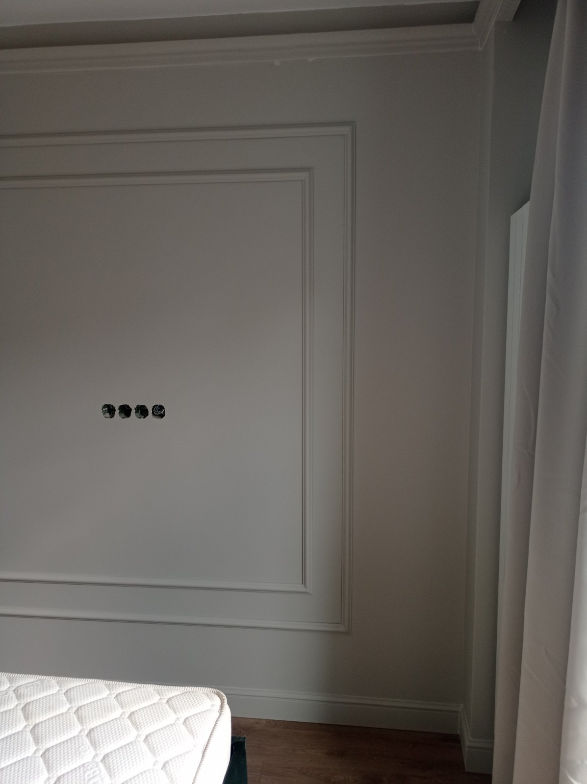 Первази от полиуретан на пода и профили от полиуретан, или корнизи ги пишат някъде, на стените. Боядисани са предварително с две ръце латекс от мен и после лепене и силикониране на снадките.