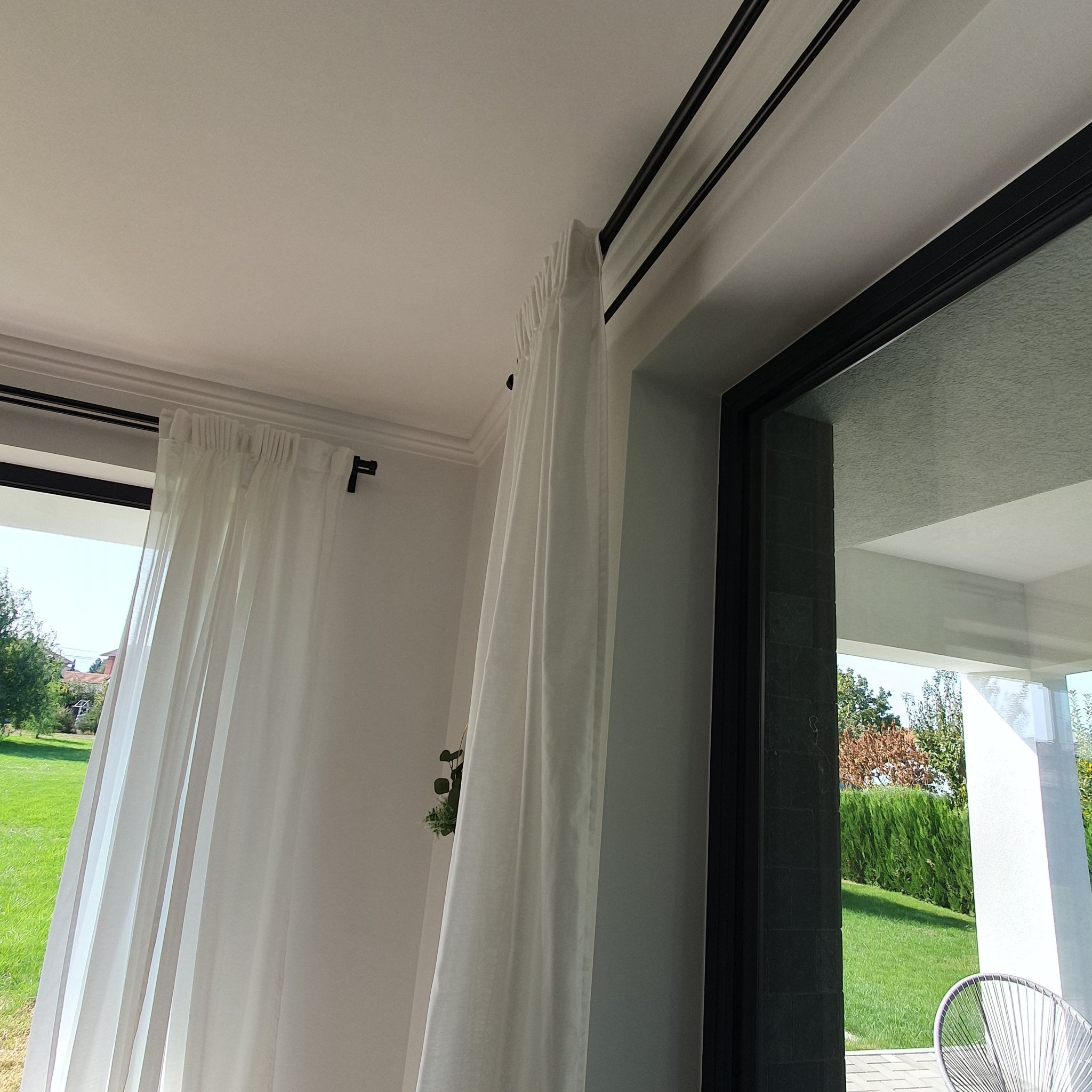 С тръбни двойни Икейски корнизи сме ,въпреки че навсякъде сме с по едно перде/завеса .Когато ги слагахме си мислех ,че може да сложа и плътно и тънко перде ,но при къща с озеленен двор си е направо грехота да скрия цялата тази зеленина навън и чувството на простор от големите прозорци .Имат среден държач и на всички прозорци ,които са като този със запитването ,завесата е разделена на 2 .При отворена врата или я дърпам пред вратата ,към средата на прозореца ,  или зад вратата .Супер доволна съм от икейския перделик ,който се нанизва в тръбния корниз без халкички .