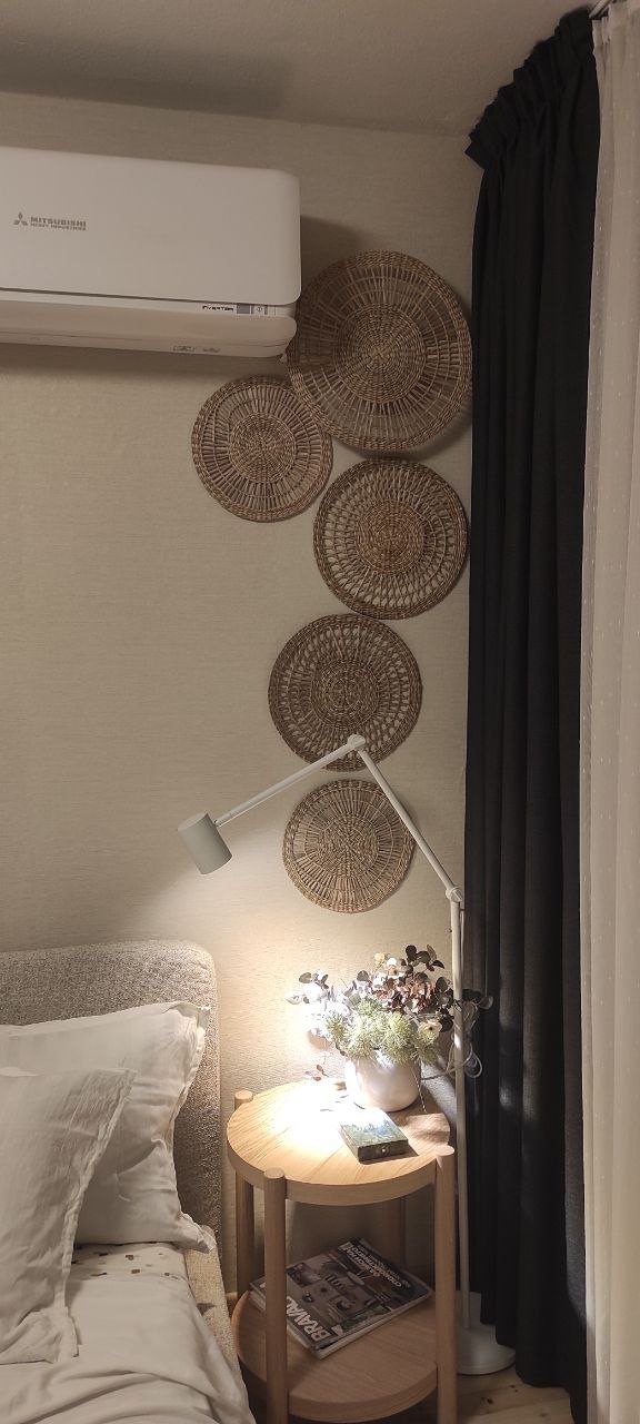 За мен декорацията скрива, но е малко странно петно декоративни елементи на цяла гола стена, а вероятно и другите са ти такива голи... Та бих добавила над цялата табла на леглото още разни и разнообразни в този стил и задължително някой други елементи също да са по - изпъкнали. Или някакво плетено пано... Аз бих скрила и климатика зад някоя красива дървена решетка.