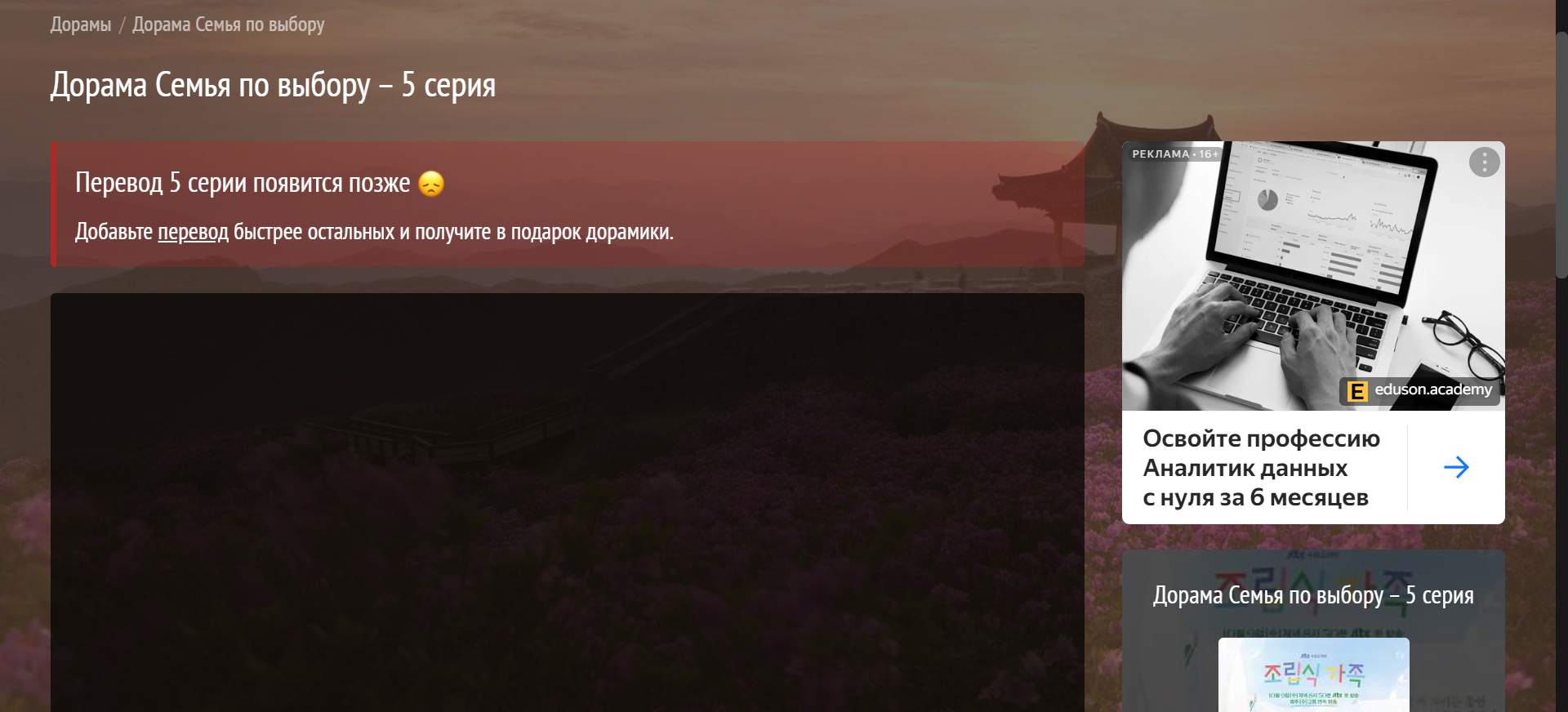 При вас отваря ли се 5та серия на Семейство по избор, при мен е това на 2 от руските дорами, черен екран другите 4 серии си вървят. Да, видях надпис че превода ще се появи по късно, но това е от седмица, досега не са се бавили толкова, а днес излиза новата серия и ще се понатрупат.