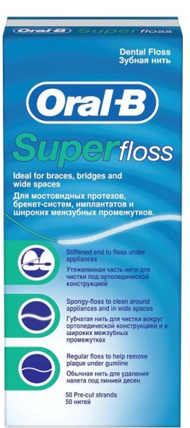 На OralB Superfloss конеца е специално за брекети. Нишките са по-различни, двата края са твърди и се пъхат лесно между зъбите, по-дълги са и самата им почистващи част е по-различна.
