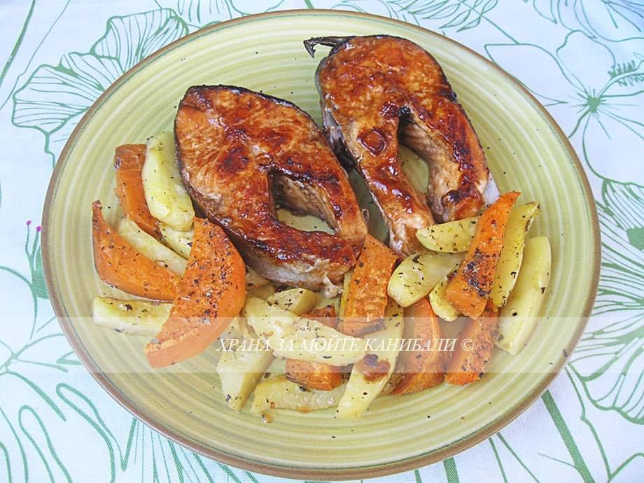 сьомгова пъстърва с печени картофи асорти,