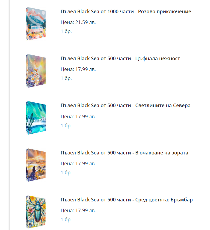 Това с малкото бройки ме тревожи Sad Сложих в количката 3 пъзела по 500ч.,и като видях сумата 54лв и сърце не ми даде да натисна бутона.