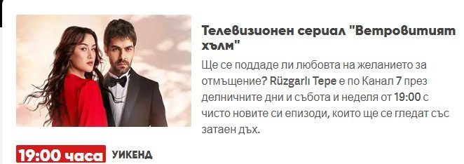 Относно смяната на Ветровития хълм направо съм възмутена. То бива глупости ама като тези пишмян. Може ли да сменят деня на излъчване. Той поне е с по приличен рейтинг от други останали. Защо не гооставиха през седмицата но в друг час все има свободен промеждутък. Ве смятам че в почивните дни ще му се вдигне рейтинга даже не мисля че смяната му е заради рейтинга. Дано феновете се активират и успеят да променят тази безумна глупост на сценаристите.
