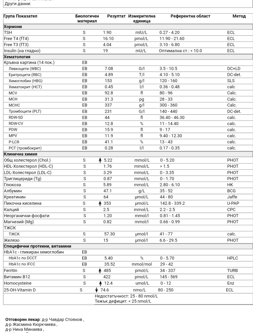 Привет! Последните ми резултати нещо не ми харесват. За кое по-напред да се тревожа, бихте ли коментирали? Съвети и препоръки? Лятото почти без месо и хляб, и сладко беше. Но с плодове. Много движение. 4-5 кг съм свалила неусетно. Еутирокс 81.5. Пия си вит Д3 непрекъснато. Ендото даде Липомезин, за който питах тук. Моля за коментар.