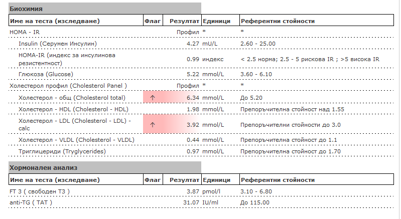Иначе за липидния профил аз бях сравнително доволна, защото имам подобрение от предните изследвания когато бях в хипо, т.е. явно си влияе това. Аз доволна казвам, че триглицеридите са паднали от 1,4 на под 1, но лекарката каза, че те много се влияят от храненето преди изследване. Също така се изказа, че за жена на моите години този ЛДЛ не е добре, и трябва да сваля поне до 3. И понеже ме видя, че се дърпам от ориза, каза че ме оставя 6м да стягам храненето и след това ще решаваме какво що, ако няма ефект.
