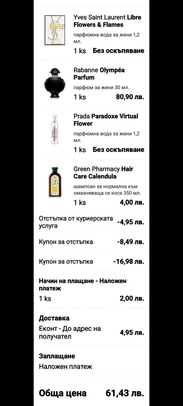 Имам проблем с приложението им. Вече трета поред поръчка идва на някакъв стар използван адрес. Въпреки че всеки път записвам адрес в момента на поръчване, на който желая да се изпрати, проверям го, запаметявам го и след това се оказва, че поръчката е с грешния адрес, който отдавна не съм използвала. Говорих с тях вчера, казаха да го записвам и в коментар, ама не ми се струва ок - няма как да помня при всяка поръчка освен в полето адрес за доставка, да преписвам същия и в коментар. Да вземат да си оправят приложението.