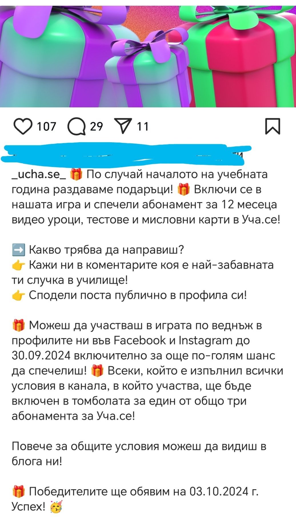 Благодаря sweet_maniche . Знма, че някой търсеше абонамент на "уча се", защоот от някоя игра не му се е паднала. Във Инстаграм пуснаха игра, мисля че за цяла година абонамент.