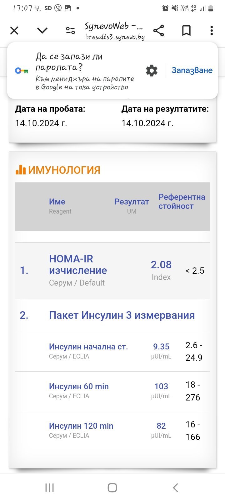 Здравейте, извинявам се, че така нахлувам в темата, но със съмнения за ИР бях изпратена на изследвания. При лекаря ще съм в четвъртък, та ако може някой да погледне резултатите ми ще съм благодарна много.