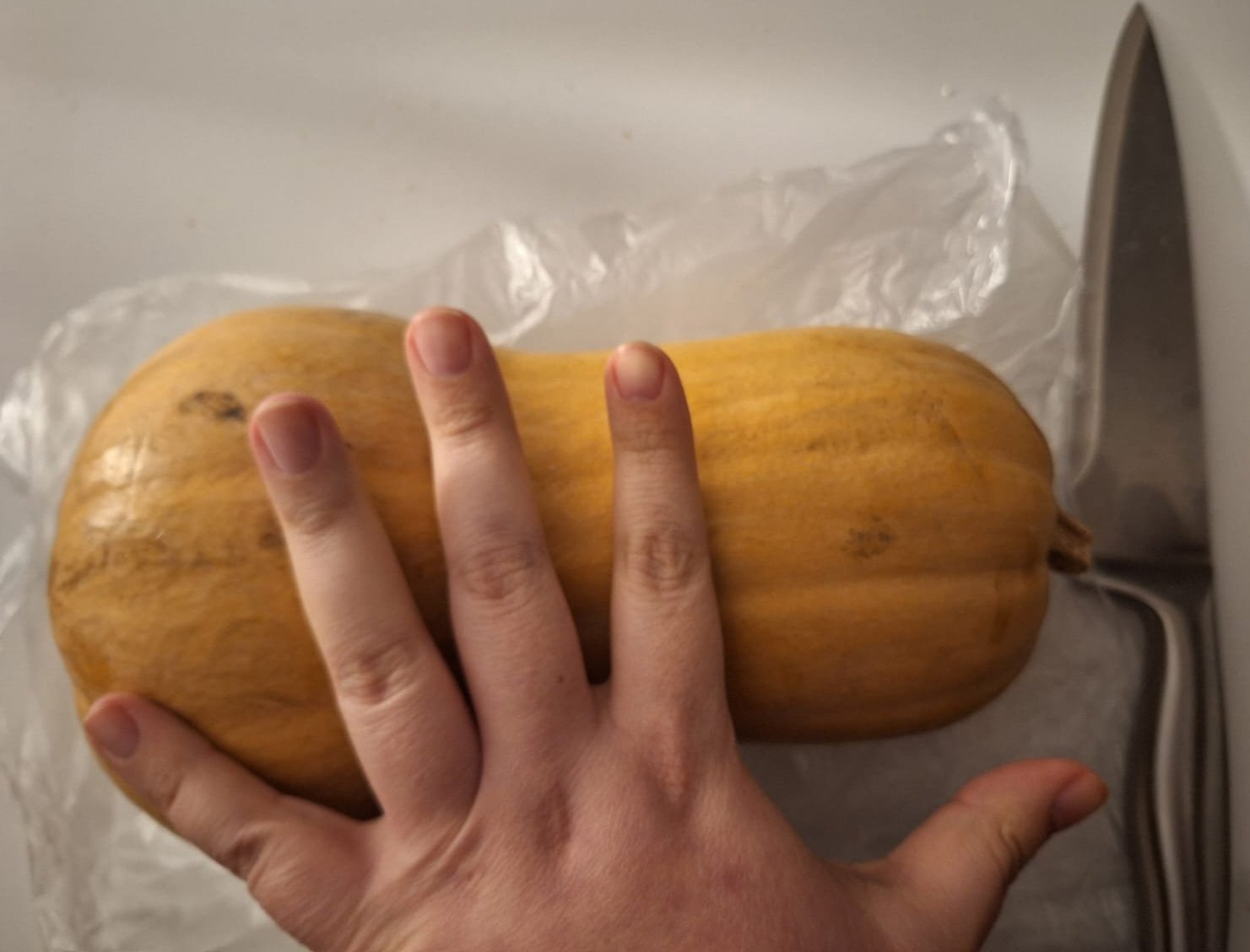 Мааалко по-голяма е отколкото изглежда де, просто снимката е от доста близо и ръката ми е осезаемо по-близо от тиквата и изглежда по-голяма. Но пак се посмях с глас като видях че той ножът ми е по-дълъг от нея Joy