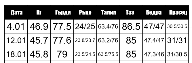 Броя калории и се храня, когато усещам глад. Като цяло залагам на ранна вечеря, гледам до 19 часА да съм приключила с храненията. Не се лишавам от никои групи, храня се балансирано, старая да вдигна протеина. Това е моята борба.