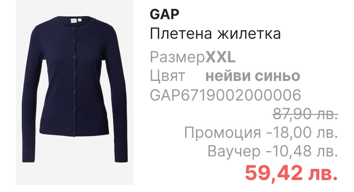 Жилетка на GAP, взех си по-голям номер от моя. Свободно ми стои и ми харесва много. 100% памук. Чакам и моят размер и тогава ще преценя.