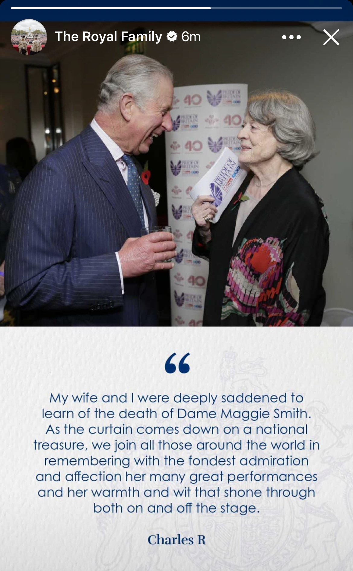 Кралят отдава почит на „националното съкровище“ дама Маги Смит, чиято топлина и остроумие „блестят както на сцената, така и извън нея“.