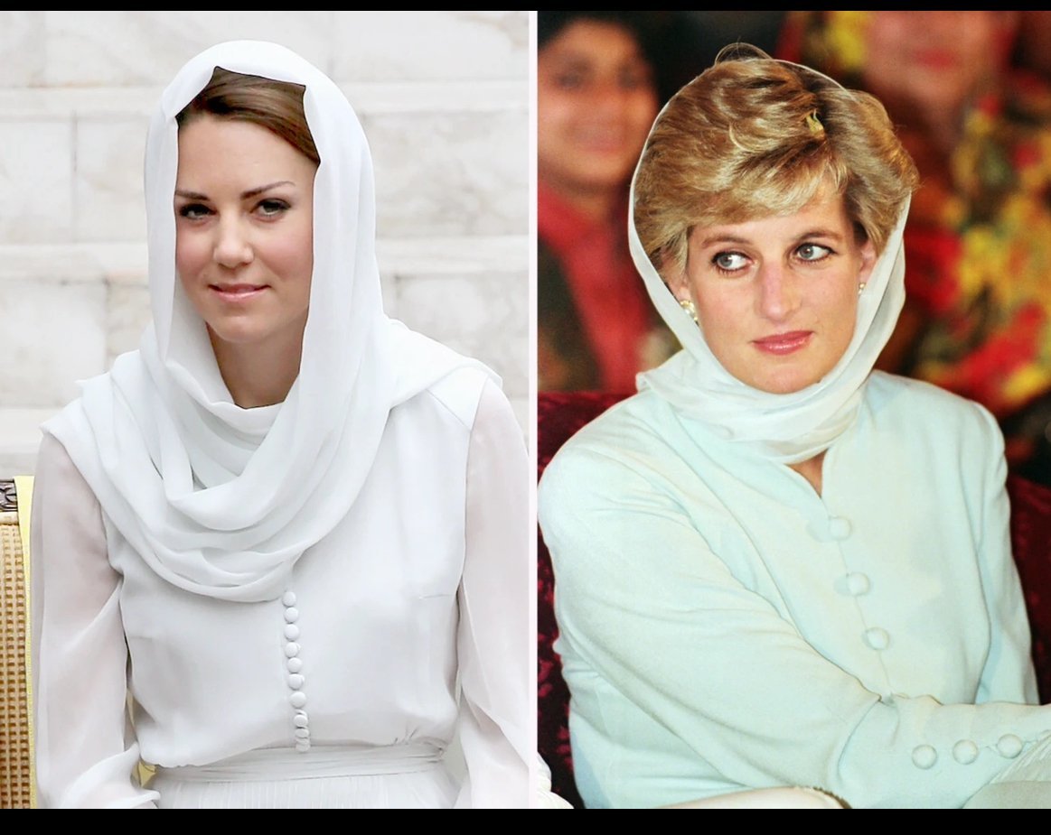 Към горния колаж с Даяна и Меган би трябвало и Кейт да добавят. Ето, и тя имала подобна пилешко жълта рокличка, зеленки, разни с пайетки, бели с черно костюмчета, шапки най-различни. Със сигурност и с шал на главата от посещение в мюсюлманска държава я има 🙂