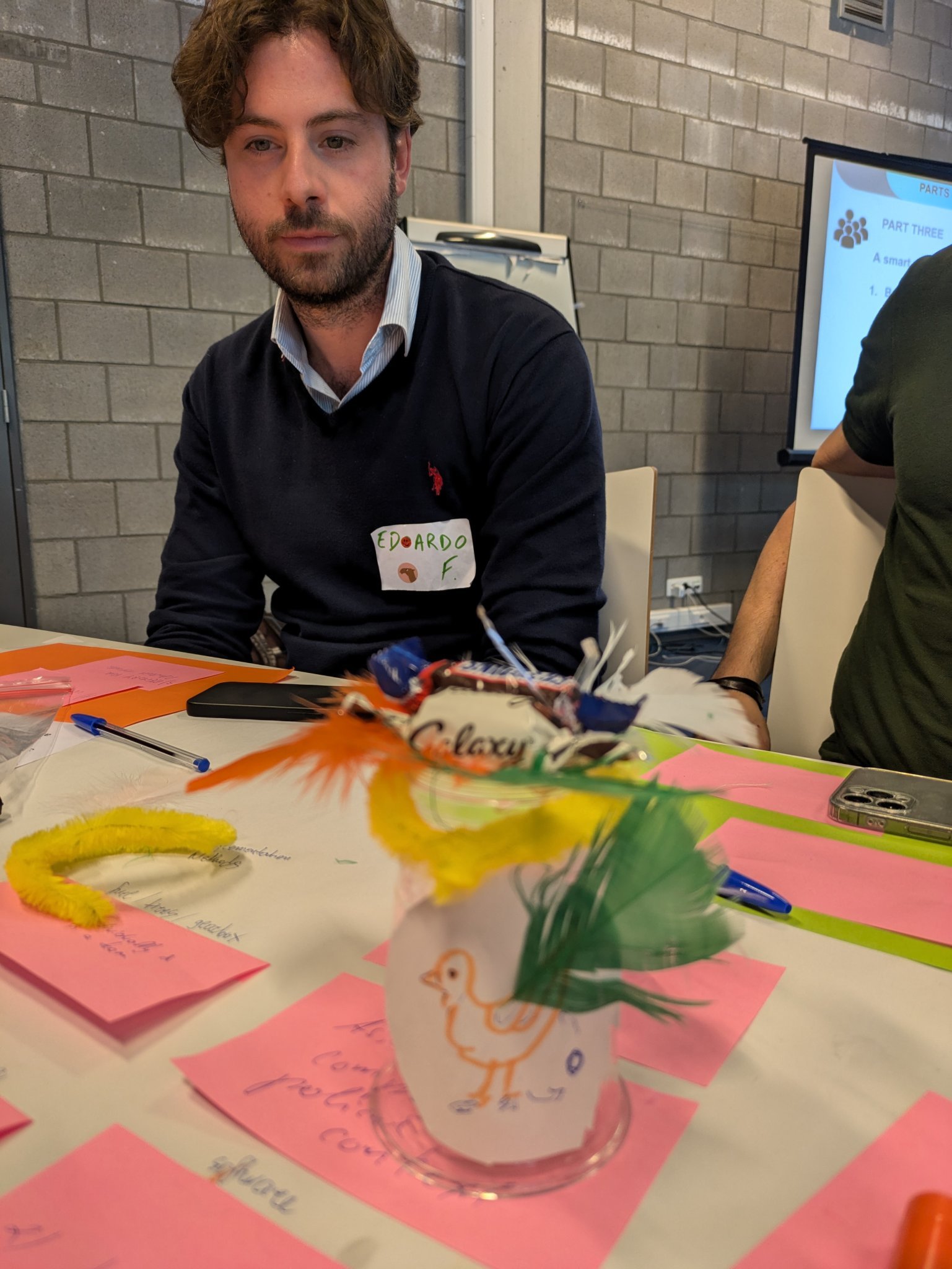Някаква шашавела ни правеше игри за пет годишни, накрая чак трябваше да творим някви простотии с пера, хартийки и лепило. Даже не ми се разказва, искам да го забравя тоя ден. Ей го произведено с все един отчаян колега