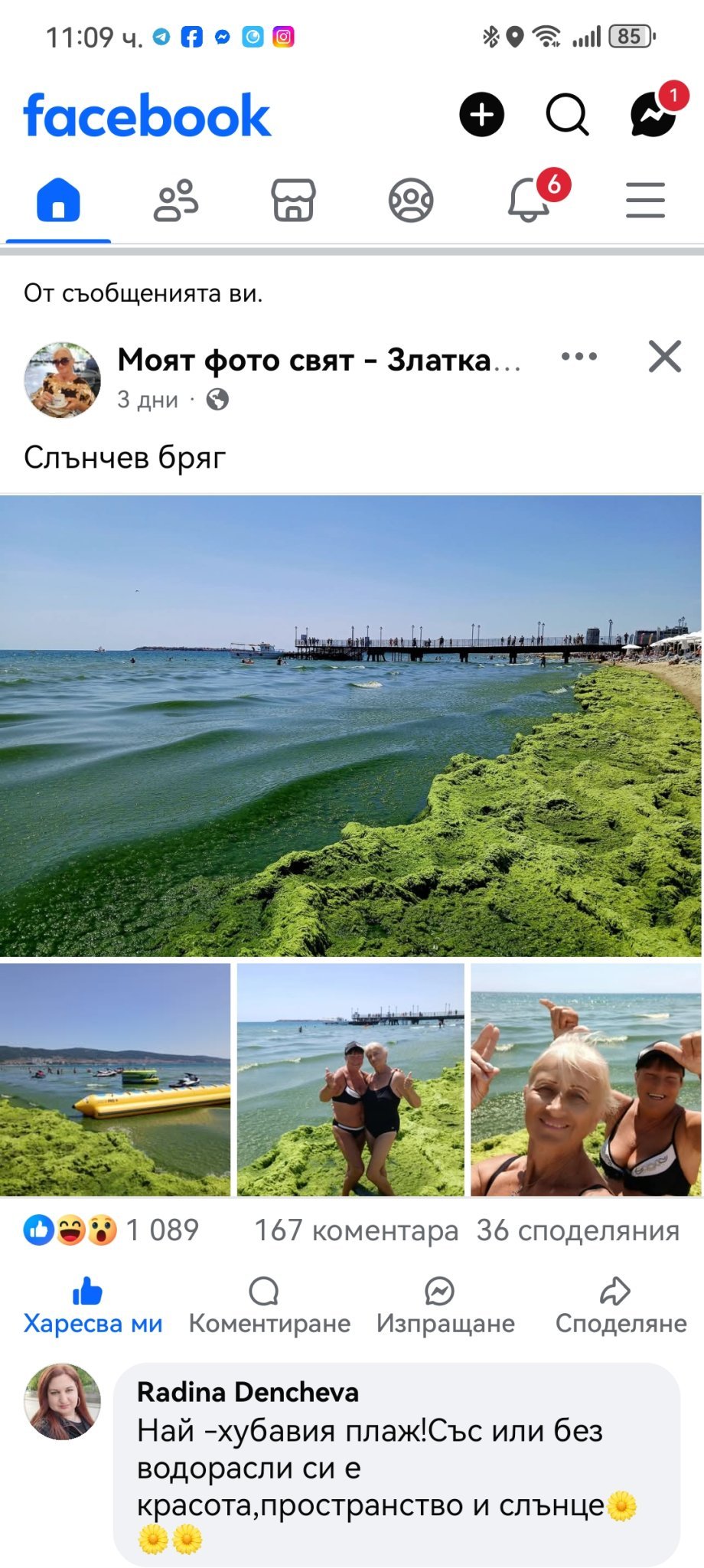 За мен тези снимки за фейк. Дори да е имало повече натрупване на водорасли и то очевидно в някаква малка част на плажа на СБ, морето със сигурност още на другия ден си ги е прибрало.  Ако си спомняте в края на август миналата година подобно явление имаше на южния плаж на Несебър и всички тв гръмнаха с репортажи от там. Морето каквото прибра, прибра, концесионерите почистиха и всичко приключи за ден - два. Ако и сега се беше появило чак такова нещо отново всички тв щяха да са го показали. Водорасли в нашето море е напълно естествено да има, защото е живо море с ниска соленост и когато температурата на водата се повиши почва цъвтеж и те се появявят. Това е природа и няма нищо страшно и опасно за къпещите се. По същият начин всяка година август се появават медузите, опасните мъртви вълнения и ред други циклични явления. Морето ни е чисто и прекрасно. Няма нужда от паника и по-малако четене в "бибилията" ФБ, че там може някой и еднорог да ви покаже, че плува в морето.