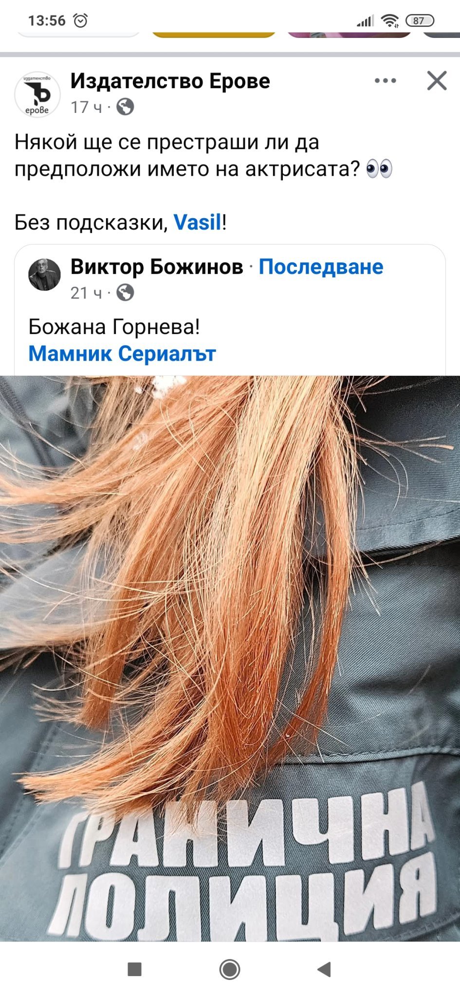 Мен ми изникна Йоана Темелкова. Последно в постановката "Аз и ти преди ние" беше с червеникава коса.