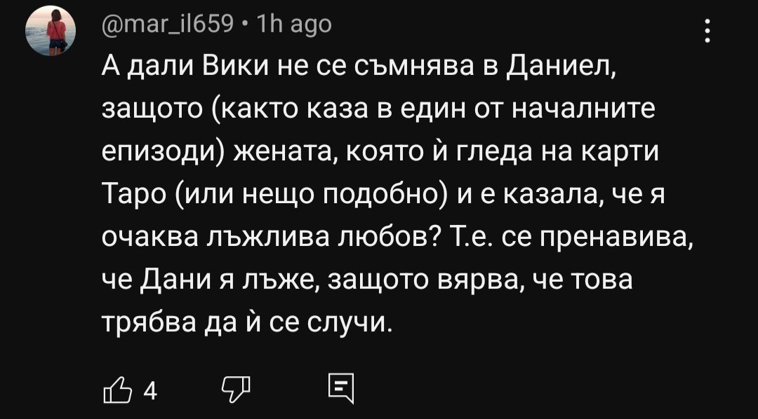 Не бих се учудила Вики да се влияе от Таро и други такива неща. Бих се побъркала, ако някой по цял ден ме занимава с "духовности".