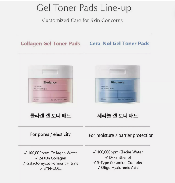 Има ги и във вариант с колаген, Biodance - Collagen Gel Toner Pads - обещават подобряване вида на порите и еластичност - съдържат ХК, Galactomyces Ferment Filtrate и пептиди.