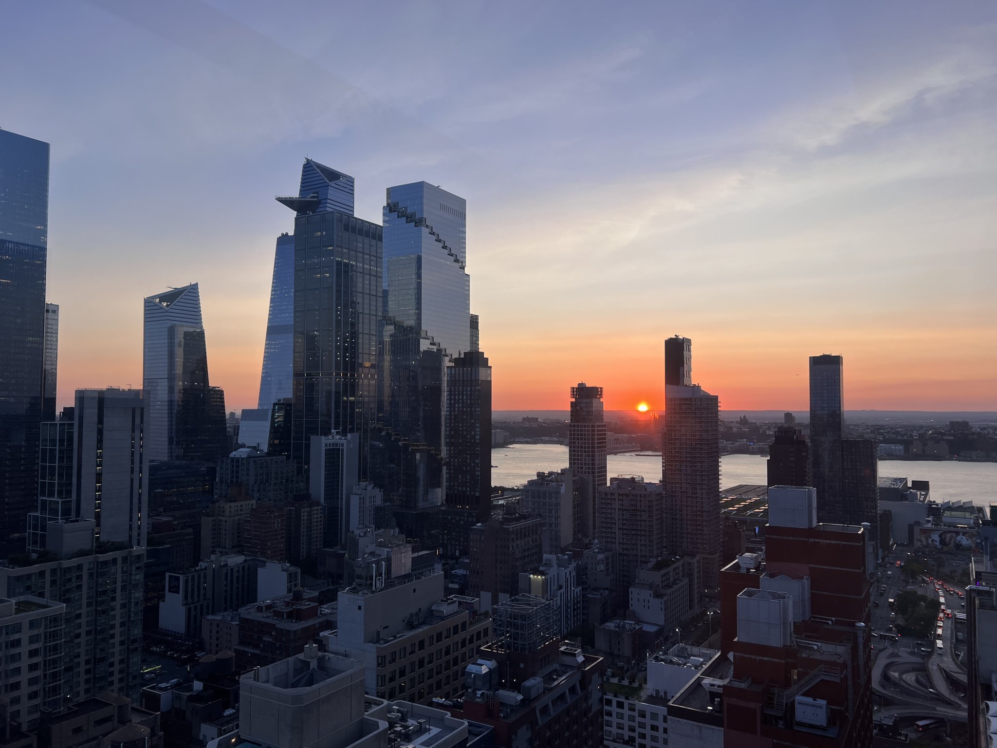 Споделям красива гледка от рууфтоп бар и невероятния залез над реката Хъдсън,: