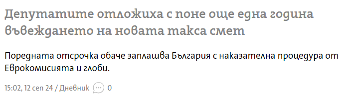 Новата методика за такса смет (не по данъчна оценка, а на глава) гледам са я отложили, трябваше да е от 1.1.2025, засега 1.1.2026 - ако не я отложат пак. Няма да се учудя - трудно ще измислят как да стане. И аз да съм депутат, и аз не мога да измисля как да го приложа в българските условия. То не се знае кой къде живее, нито кой колко кг боклук изхвърля, как да го направиш така, че да спазиш европейските директиви, но и местните особености?