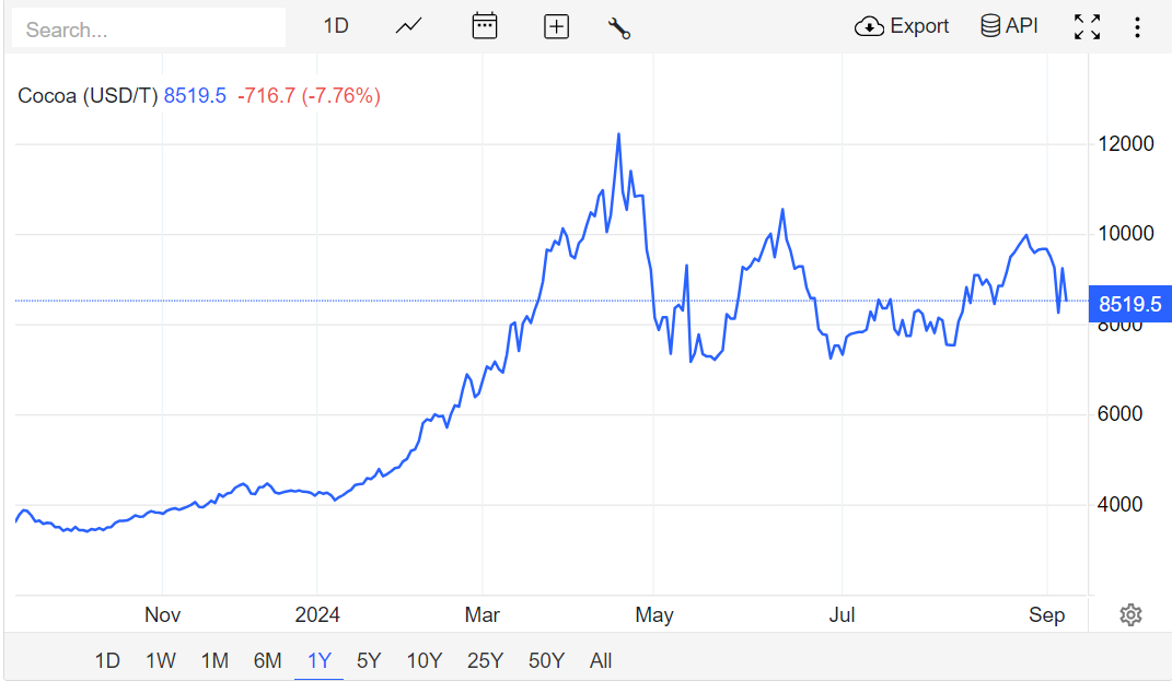 За шоколада мисля изтърва момента. По-рано тази година можеше да направиш пари от какаото (то директно влияе на цената на шоколада). Но пак взе, че падна. Кой го знае ще се качи ли пак.