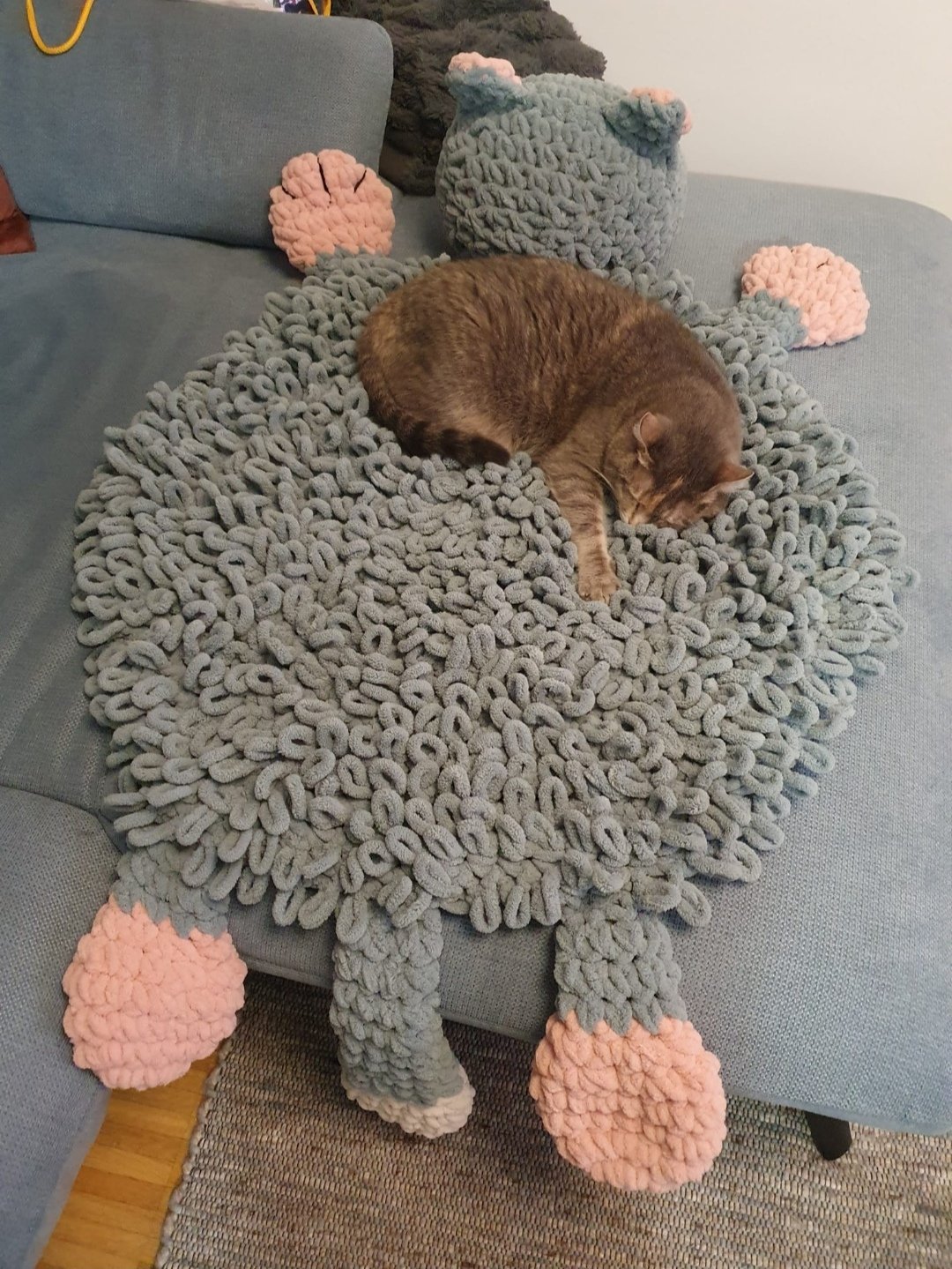 Докато търсех снимката, попаднах на снимки на Дейзи. Дъщеря ми оплете килимче за детската стая и кипрата първа го изпробва. Grinning