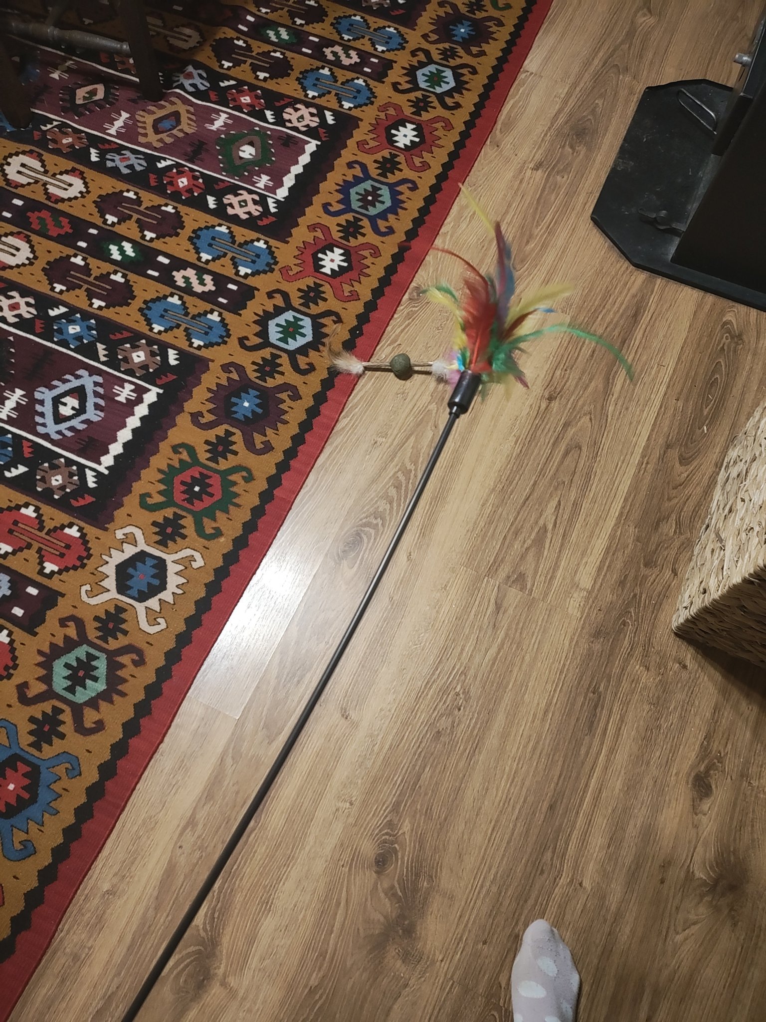 Въдичката с перца я вадим , за да играем ние с нея, да скача след вечеря, да се измори и да спи. Ако ѝ оставим, ще има гола пръчка и пера из къщата.
