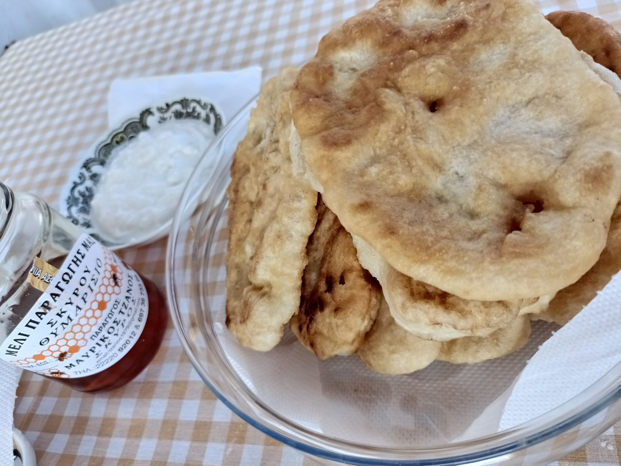 На Скирос вместо хляб, се консумират мекици. В таверните си поръчваш една голяма кръгла мекица и я ядеш с....риба, месо....