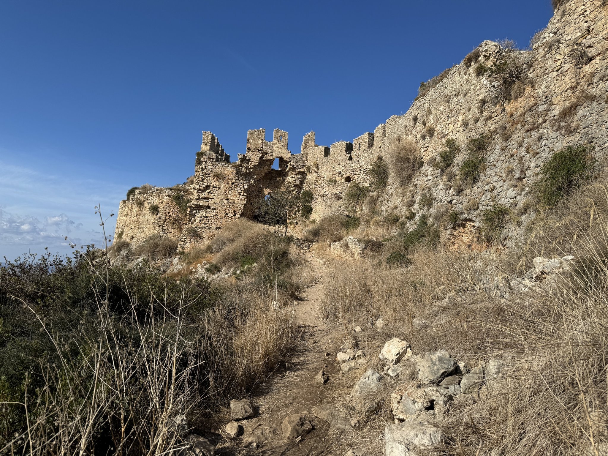 До крепостта, от която се правят панорамните снимки, може да се стигне по два начина – или да се тръгне от плажа Πέρασμα Συκιάς, като пътят от тази страна, по мое мнение, е много лесен и се вие доста плавно, с изключение на един-единствен по-стръмен участък, който е точно преди входа на крепостта. Може би за около най-много 50 мин. си горе, тръгвайки от плажа, който споменах.