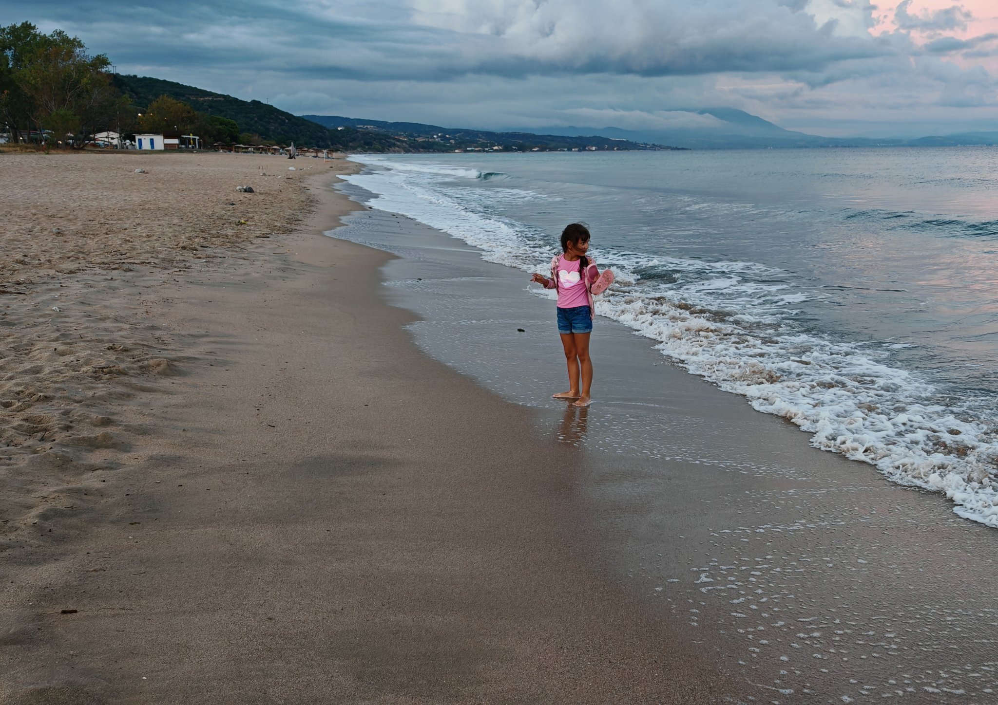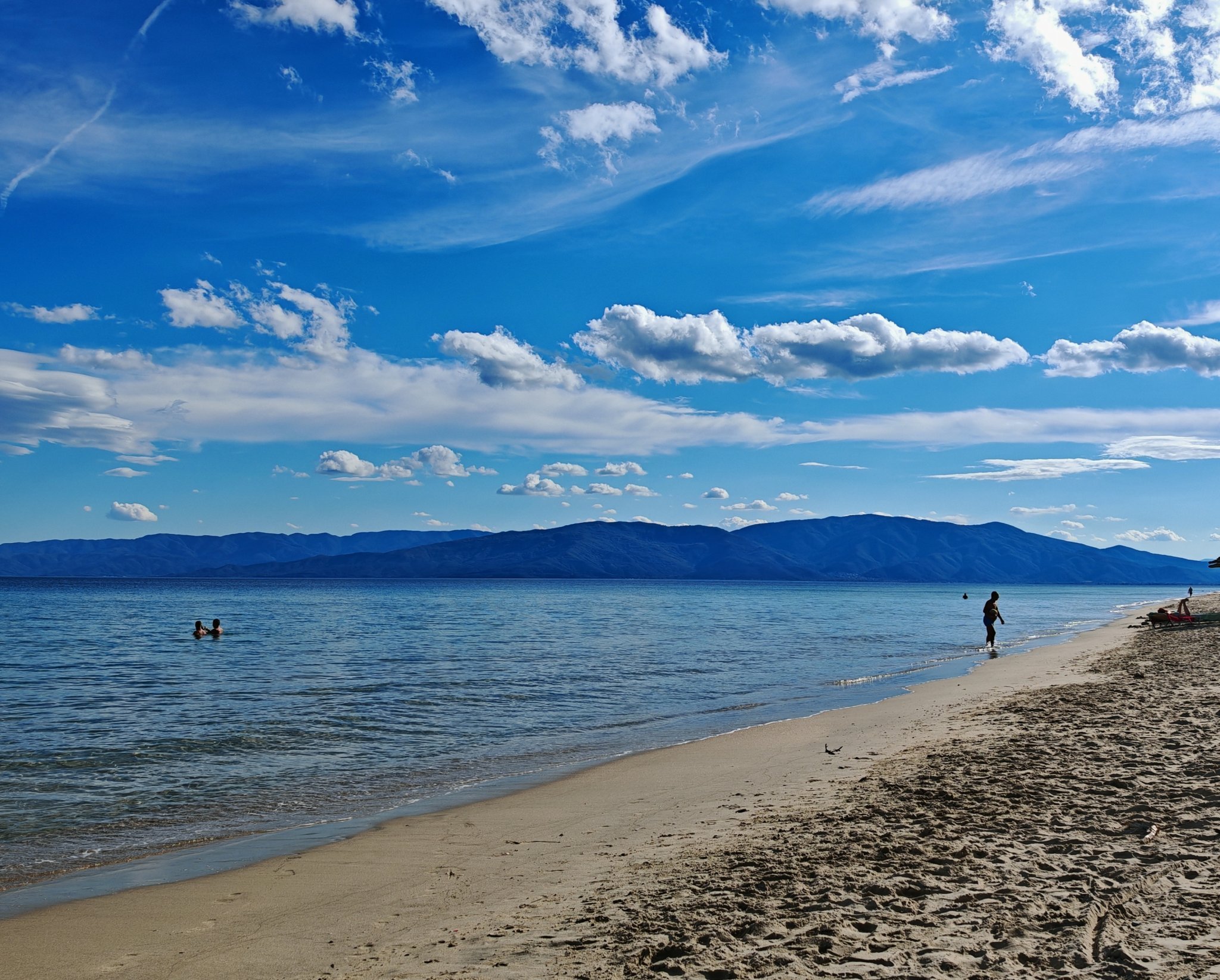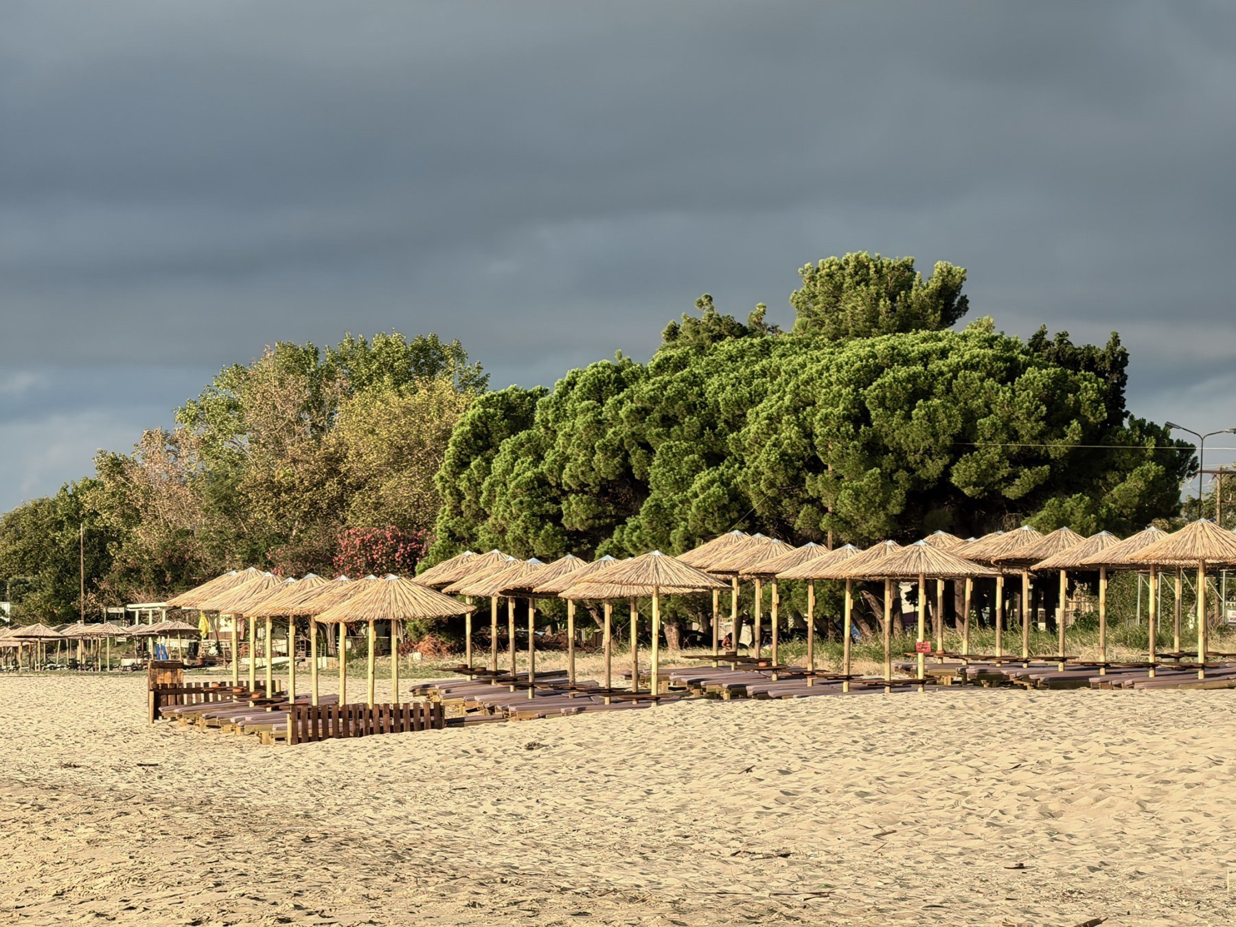 Да си кажа, че съм приятно изненадана от мястото, където сме -вилна зона на 8 км. от Аспровалта. Плажната ивица е широка, пясъчна, без камъни на влизане във водата и с постепенно увеличаване на дълбокото. Идеално е за деца. На две места има обособена плажна зона, но с голямо разстояние помежду им. На едното място до 10.09 се плащаше 6 евро за два шезлонга и чадър, след това спряха да взимат пари. На другото място не се плащат шезлонгите, но има консумация, без минимална сума. Много е спокойно, водата е кристална, топла и почти без вълни. Времето ни е малко променливо, но реално само един ден ни валя дъжд. 🙂