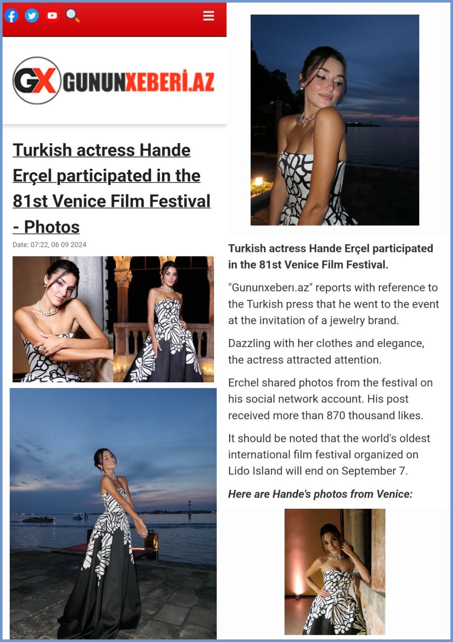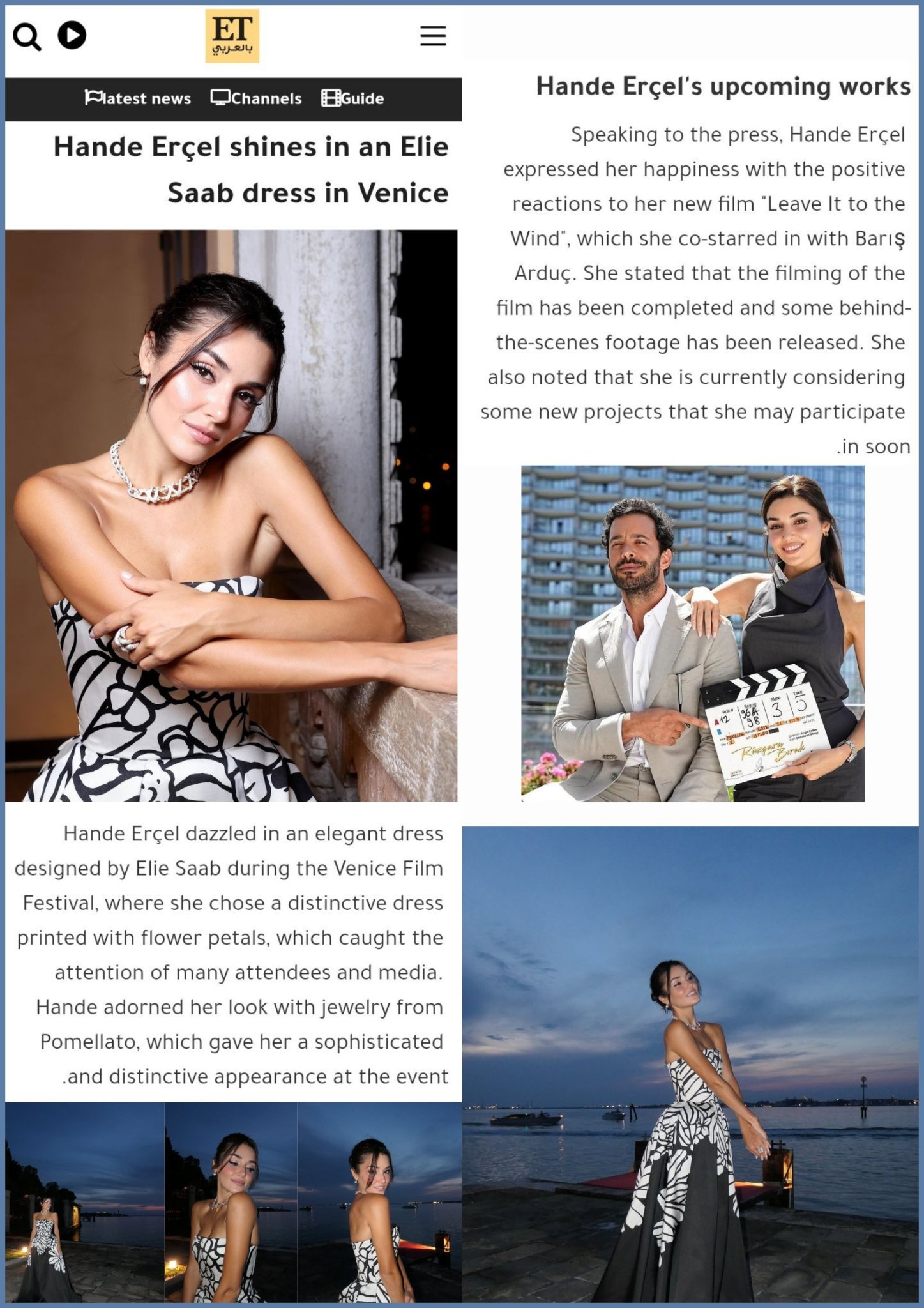 В най-голямото арабско списание @ETbilArabi: „HandeErçel блести в рокля на Elie Saab във Венеция“
