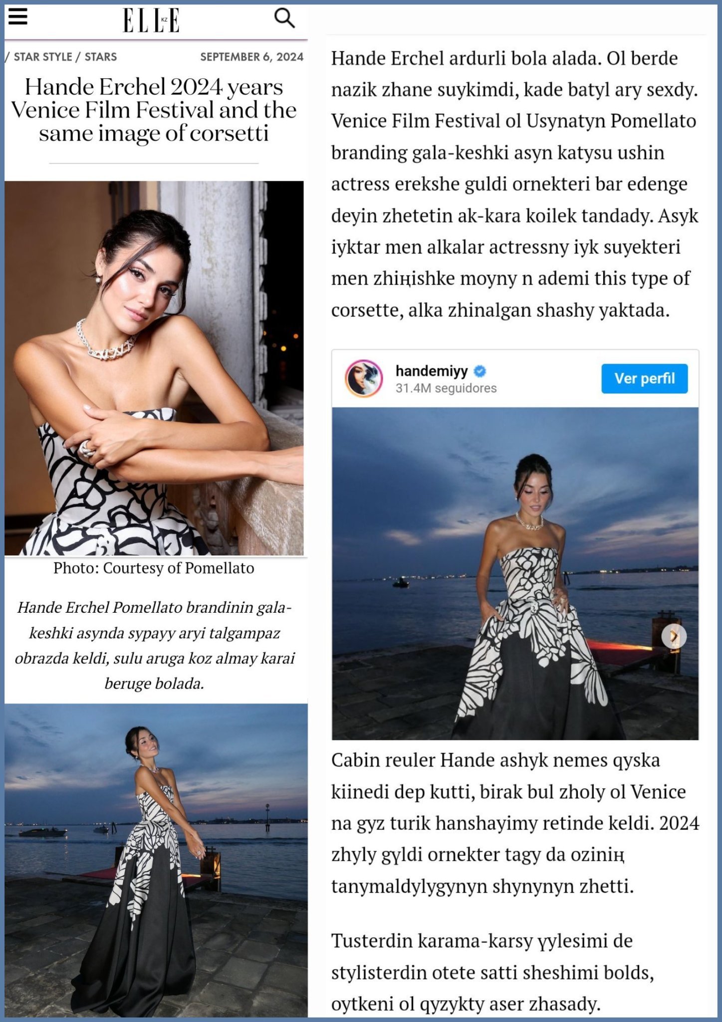 Нова статия от списание ELLE Казахстан за присъствието на #HandeErçel на събитието Pomellato, което се проведе във Венеция.