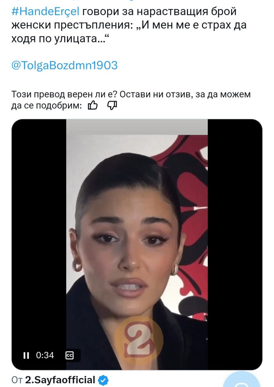 Журналист: Тогава позволете ми да ви задам един много ясен въпрос. Не като на актрисата Ханде Ерчел. Чувствате ли се в безопасност като жена?