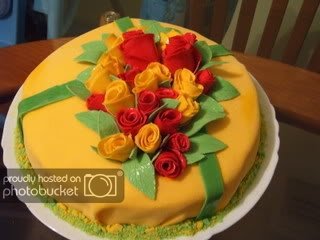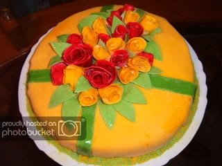 Момичета, иде ми да ви нацелувам! Сътворих торта следвайки вашите напътствия. Розите и листата са страшно твърди, чаршафът не никак добре разстлан, вътре не е кой знае какво, но мама има 50-годишен юбилей утре и мисля, че ще оцени усилията ми в домашни условия /учила е сладкарство/. За първи път правя такова нещо, а за втори път изобщо меся, така, че резултата за мен е супер. БЛАГОДАРЯ ВИ! ето я: