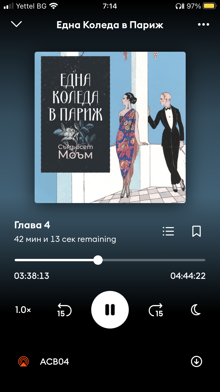 Аз съм възхитена от всички книги на Макфадън (без One by one). Все още не съм започнала сагата с прислужницата. Освен, че слушам Моъм, чета на хартия Гришам-Пазителите.