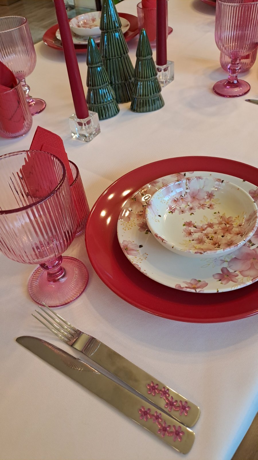 Чашите също! И приборите са интересни! За мен са с пролетна тематика, но пък си ги напаснала чудесно е елхата
