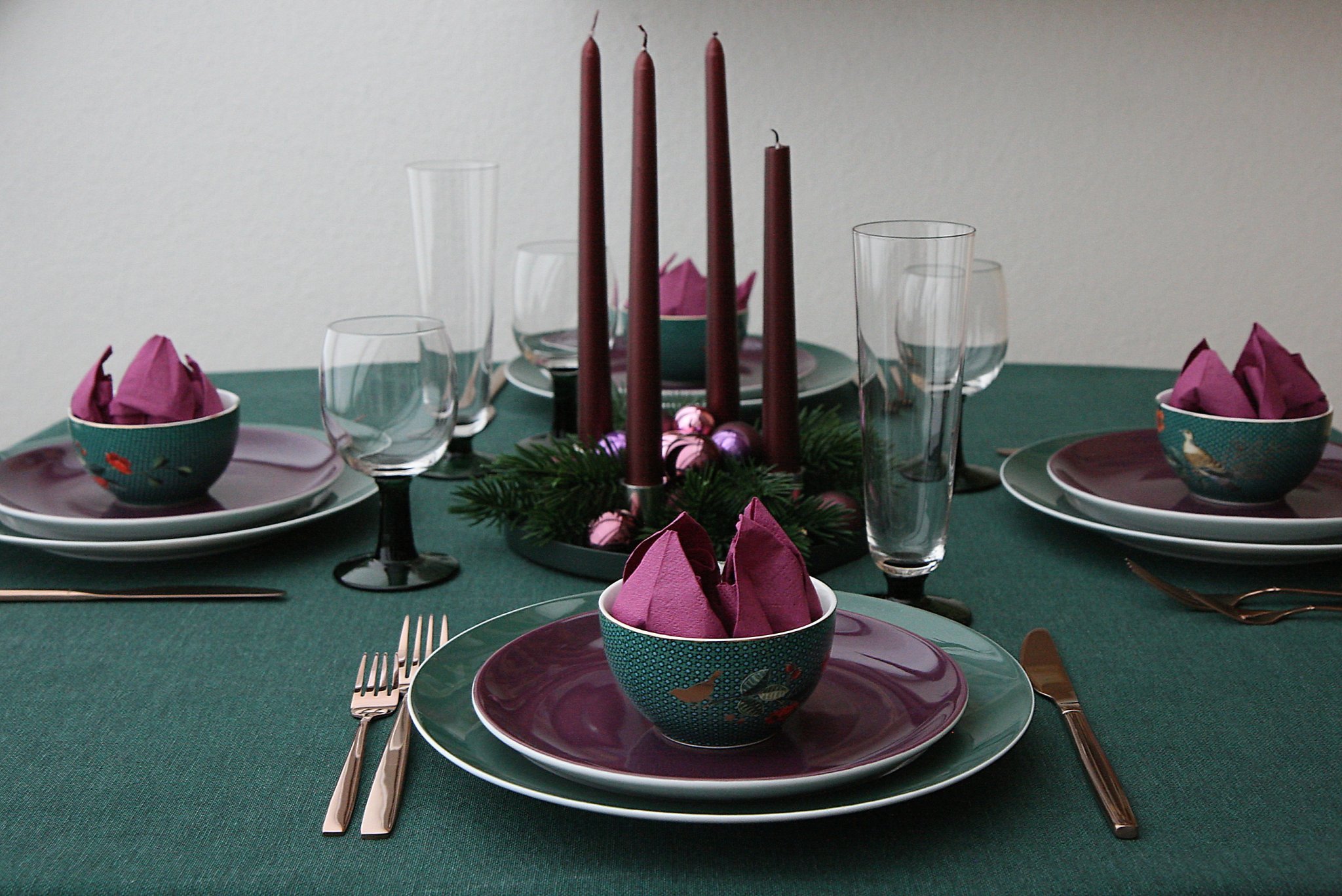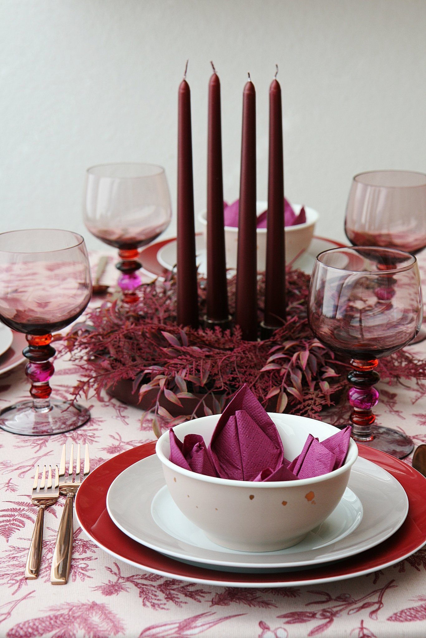 , както си му е редът. Вкъщи явно е доста сух като цяло въздуха, много бързо изсъхват и започват да се ронят твърде много.. затова от години ползвам изкуствени. Тази година започвам с бордо (тази покривка доста си я харесвам и веднъж в годината през зимата я слагам), но.. със смяна на покривка и декорация през декември, вероятно ще запазя свещите, но заменя бордото с зелени клонки..