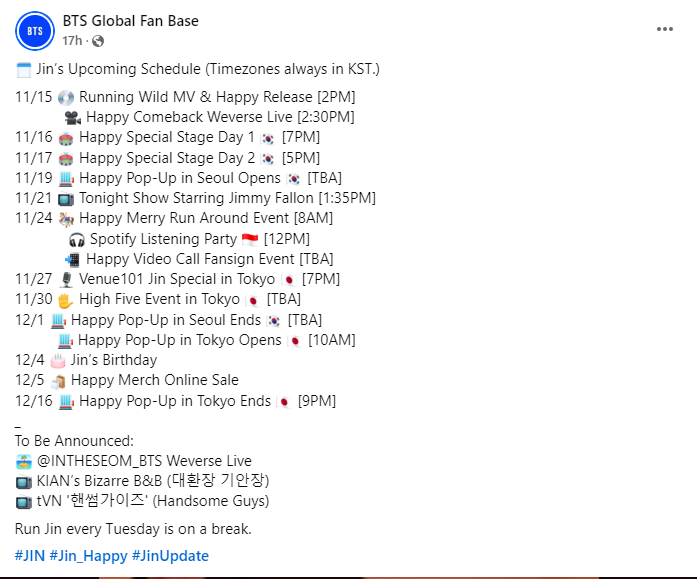 В момента BTs са в казарма, но продължават да поддържат интереса на феновете с индивидуални албуми и проекти. Шуга беше глобен с 15 милиона KRW (приблизително 11 200 USD) за шофиране в нетрезво състояние, но не беше осъден. Джин изпълнява ролята на Гучи Амбасадор, участвайки в модни събития в Милано. Джимин и другите членове работят по свои солови проекти и самостоятелни албуми, за да продължат да ангажират феновете. Основната им цел е да се съберат отново през юни 2025 г.