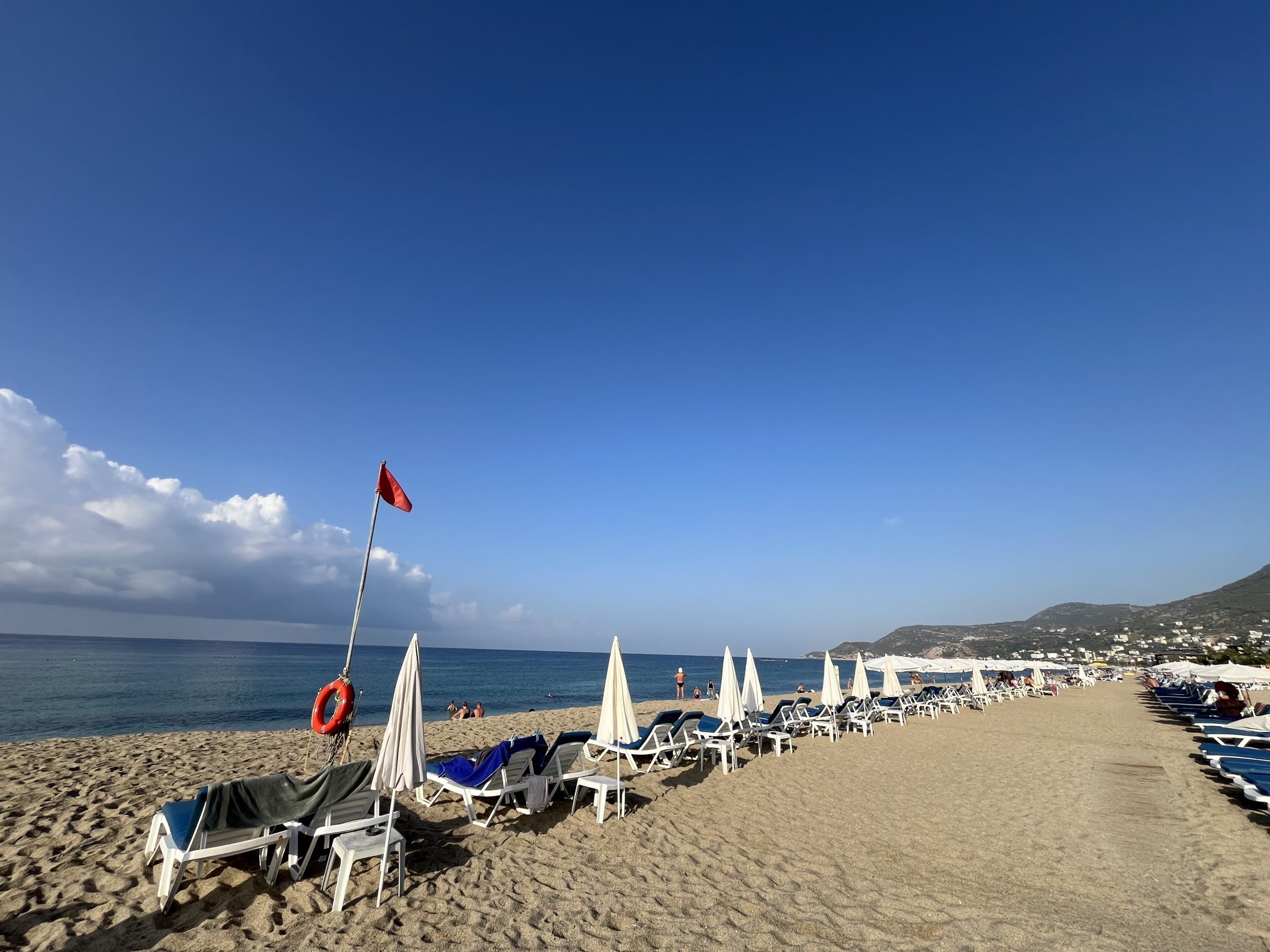 Сутринта, 9 часа, централен плаж Алания. Няма никой, свободни шезлонги, свободен плаж, топло е, вече става за препичане.