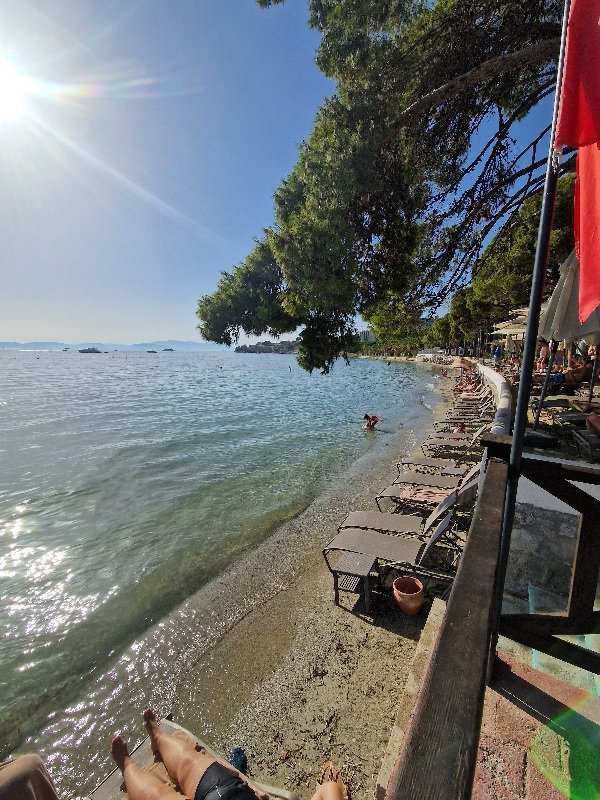 Плаж - малък, камъняк, пирс /един мъж се раздра на счупената му стълба, та влиъахме в морето със скокове/.