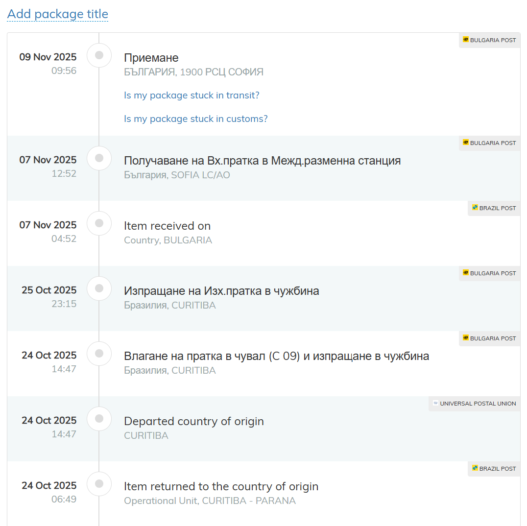 Имам драма с една пратка - накратко пратка до Бразилия, по някаква причина беше спряна от бразилските митници и изписа че ще я връщат, изчезна за половин година (очевидно е отлежавала в митнически склад) и на 25 октомври я изпратиха обратно. На 7 ноември "влезе" в България и оттогава е със статус "Приемане БЪЛГАРИЯ, 1900 РСЦ СОФИЯ".