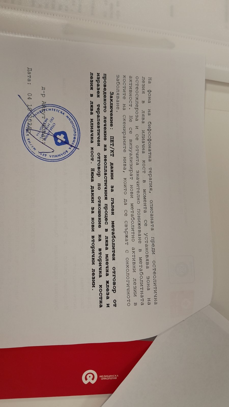 Имам голямо образувание, което от немърливост неглежирах. В ИСУЛ ме изпрати приятелка при д-р Йордан Спирдонов. Той ми направи кор-биопсия и хистологията показа какъв е тумора. Онколожка от ИСУЛ ми назначи терапията. Имам заразени 3-4 л.в и затова ми казаха, че трябва цялостна лимфна дисекция.
